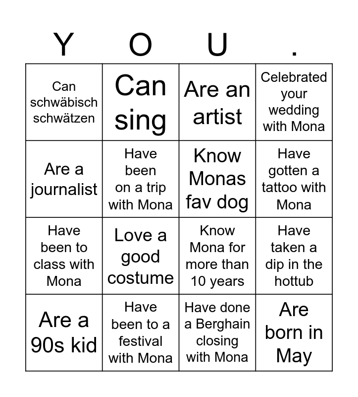 This bingo card has 20 words: Have taken a dip in the hottub, Can do a trick, Are an artist, Know 3 facts about the Kakapo, Are a 90s kid, Are a journalist, Have been to a festival with Mona, Can schwäbisch schwätzen, Have been to class with Mona, Can sing, Love a good costume, Know Mona for more than 10 years, Have been on a trip with Mona, Are born in May, Know Monas fav dog, Perform tonight, Have gotten a tattoo with Mona, Celebrated your wedding with Mona, Have done a Berghain closing with Mona and Are part of the alphabet mafia.