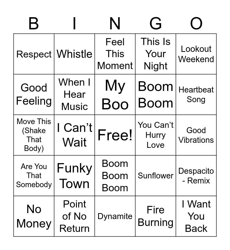 This bingo card has a free space and 41 words: Tha Crossroads, Move This (Shake That Body), In A Dream, When I Hear Music, Point of No Return, Boom Boom Boom, My Boo, Children, Lookout Weekend, Are You That Somebody, I Can’t Wait, This Is Your Night, I Want You Back, Good Vibrations, You Can’t Hurry Love, Funky Town, It’s Not Unusual, Respect, Happy, Feel This Moment, Despacito - Remix, Grenade, Dynamite, Boom Boom, Since U Been Gone, Bye Bye Bye, Fire Burning, Keep Your Head Up, Heartbeat Song, When Can I See You Again?, The Way I Are, Whistle, No Money, Magic, Sunflower, Good Feeling, Wannabe, Forget You, Just Can’t Get Enough, The Time (Dirty Bit) and Use Somebody.