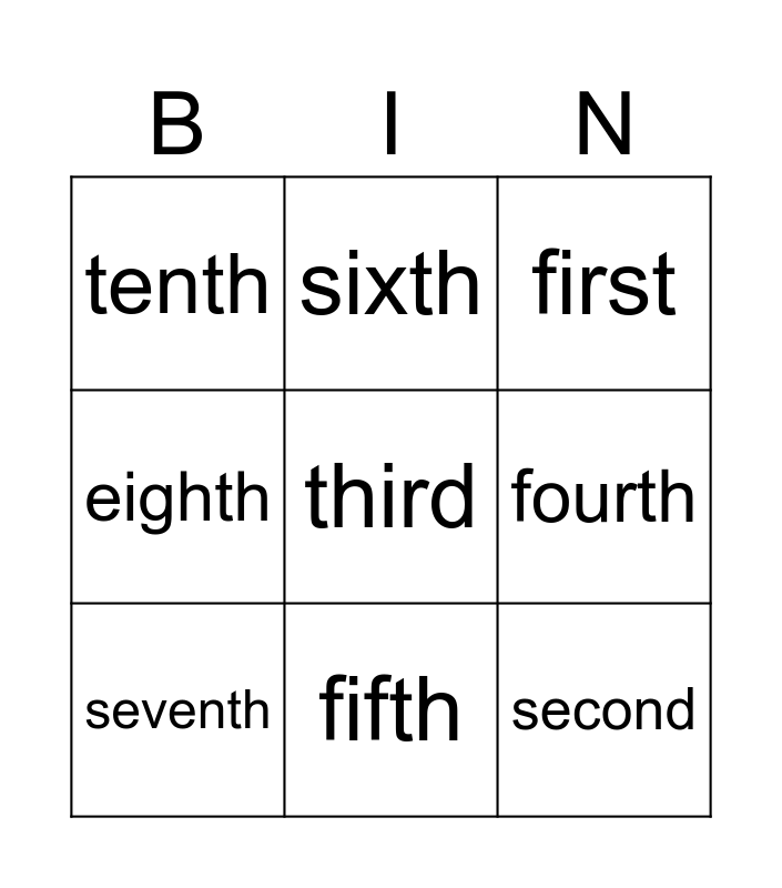 This bingo card has 9 words: seventh, first, sixth, eighth, tenth, fourth, third, second and fifth.