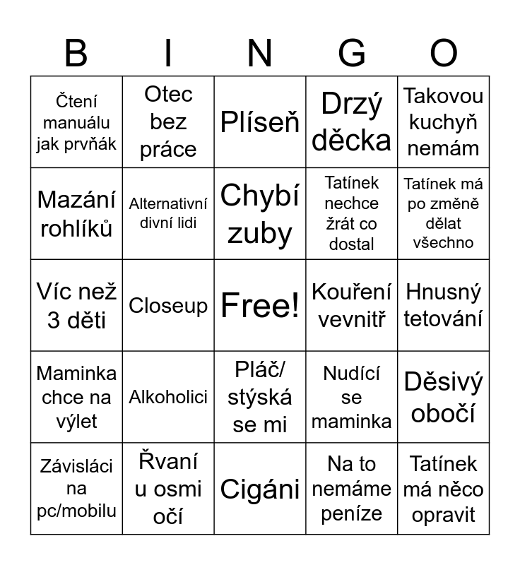 This bingo card has a free space and 24 words: Alkoholici, Řvaní u osmi očí, Chybí zuby, Závisláci na pc/mobilu, Takovou kuchyň nemám, Čtení manuálu jak prvňák, Mazání rohlíků, Otec bez práce, Kouření vevnitř, Pláč/ stýská se mi, Tatínek nechce žrát co dostal, Víc než 3 děti, Nudící se maminka, Děsivý obočí, Alternativní divní lidi, Na to nemáme peníze, Hnusný tetování, Plíseň, Tatínek má po změně dělat všechno, Closeup, Tatínek má něco opravit, Maminka chce na výlet, Drzý děcka and Cigáni.