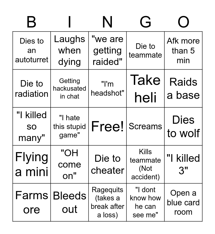 This bingo card has a free space and 24 words: "OH come on", Bleeds out, "I'm headshot", Farms ore, Afk more than 5 min, Dies to an autoturret, Die to radiation, Laughs when dying, Screams, Die to cheater, Take heli, "I killed so many", Kills teammate (Not accident), "I killed 3", Getting hackusated in chat, "I dont know how he can see me", Dies to wolf, "we are getting raided", Raids a base, "I hate this stupid game", Open a blue card room, Flying a mini, Die to teammate and Ragequits (takes a break after a loss).