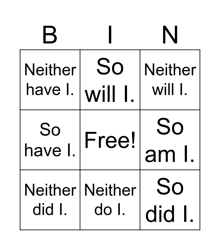 This bingo card has a free space and 11 words: So do I., Neither do I., So did I., Neither did I., So will I., Neither will I., So am I., Neither am I., So have I., Neither have I. and Neither have they..