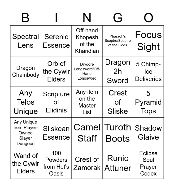 This bingo card has 25 words: Sliskean Essence, Crest of Zamorak, Drygore Longsword/Off-Hand Longsword, Wand of the Cywir Elders, Focus Sight, Spectral Lens, Dragon Chainbody, Serenic Essence, Crest of Sliske, Camel Staff, Dragon 2h Sword, Any Telos Unique, Turoth Boots, Shadow Glaive, Orb of the Cywir Elders, Eclipse Soul Prayer Codex, 5 Pyramid Tops, Off-hand Khopesh of the Kharidian, 5 Chimp-Ice Deliveries, Scripture of Elidinis, Any item on the Master List, 100 Powders from Het's Oasis, Any Unique from Player-Owned Slayer Dungeon, Pharaoh's Sceptre/Sceptre of the Gods and Runic Attuner.