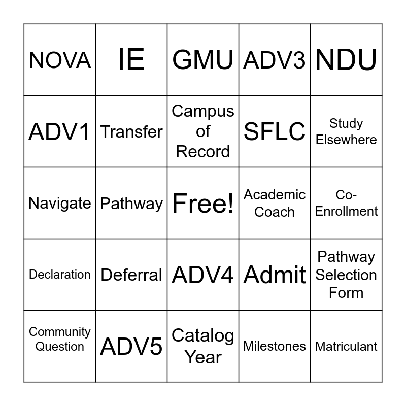 This bingo card has a free space and 30 words: ADV5, Success Coach, Pathway, SIS, NOVA, GMU, Transfer, ADV4, Academic Coach, Catalog Year, Co-Enrollment, Matriculant, Milestones, Reverse Transfer, Study Elsewhere, Termination Exception, Admit, Declaration, Deferral, NDU, Navigate, Cohort, IE, SFLC, ADV1, ADV3, Pathway Selection Form, Community Question, Campus of Record and ADV2.