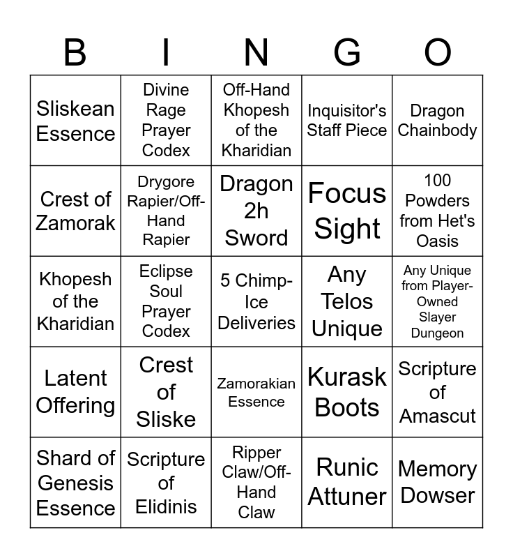 This bingo card has 25 words: Crest of Sliske, Ripper Claw/Off-Hand Claw, Dragon 2h Sword, Shard of Genesis Essence, Dragon Chainbody, Sliskean Essence, Crest of Zamorak, Divine Rage Prayer Codex, Any Telos Unique, Zamorakian Essence, Focus Sight, Khopesh of the Kharidian, Kurask Boots, Scripture of Amascut, Drygore Rapier/Off-Hand Rapier, Memory Dowser, Any Unique from Player-Owned Slayer Dungeon, Off-Hand Khopesh of the Kharidian, 100 Powders from Het's Oasis, Eclipse Soul Prayer Codex, 5 Chimp-Ice Deliveries, Scripture of Elidinis, Latent Offering, Inquisitor's Staff Piece and Runic Attuner.