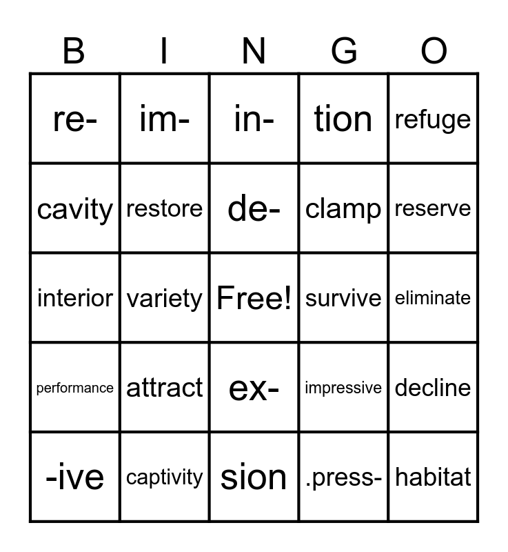 This bingo card has a free space and 24 words: attract, captivity, de-, -ive, refuge, re-, cavity, im-, survive, ex-, clamp, interior, impressive, decline, restore, .press-, eliminate, in-, reserve, variety, habitat, performance, tion and sion.