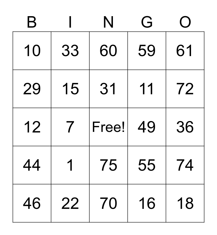 This bingo card has a free space and 24 words: 1, 22, 31, 46, 61, 10, 29, 33, 49, 75, 11, 12, 55, 74, 15, 16, 36, 60, 72, 7, 18, 44, 59 and 70.