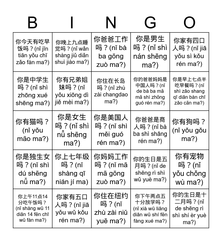 This bingo card has 37 words: 你的生日是九月吗?(nǐ de shēng rì shì jiǔ yuè ma?), 你去过中国吗?(nǐ qù guò zhōng guó ma?), 你今年十二岁吗?(nǐ jīn nián shí èr suì ma?), 你有兄弟姐妹吗?(nǐ yǒu xiōng dì jiě mèi ma?), 你有宠物吗?(nǐ yǒu chǒng wù ma?), 你上七年级吗?(nǐ shàng qī nián jí ma), 你住在长岛吗?(nǐ zhù zài changdao ma?), 你在中国出生吗?(nǐ zài zhōng guó chū shēng ma?), 你家有四口人吗?(nǐ jiā yǒu sì kǒu rén ma?), 爷爷奶奶住在你家吗?(yé yé nǎi nai zhù zài nǐ jiā ma?), 你是女生吗?(nǐ shì nǚ shēng ma?), 你是男生吗?(nǐ shì nán shēng ma?), 你是美国人吗?(nǐ shì měi guó rén ma?), 你有狗吗?(nǐ yǒu gǒu ma?), 你是中学生吗?(nǐ shì zhōng xué shēng ma?), 你是独生女吗?(nǐ shì dú shēng nǚ ma?), 你是独生子吗?(nǐ shì dú shēng zǐ ma?), 你爸爸工作吗?(nǐ bà ba gōng zuò ma?), 你妈妈工作吗?(nǐ mā mā gōng zuò ma?), 你爸爸是商人吗?(nǐ bà ba shì shāng rén ma?), 你今天有吃早饭吗?(nǐ jīn tiān yǒu chī zǎo fàn ma?), 你是早上七点半吃早餐吗?(nǐ shì zǎo shang qī diǎn bàn chī zǎo cān ma?), 你上午11点14分吃午饭吗?(nǐ shàng wǔ 11 diǎn 14 fēn chī wǔ fàn ma?), 你住在纽约吗?(nǐ zhù zài niǔ yuē ma?), 你早上八点上学吗?(nǐ zǎo shang bā diǎn shàng xué ma?), 你下午两点五十分放学吗?(nǐ xià wǔ liǎng diǎn wǔ shí fēn fàng xué ma?), 你晚上九点睡觉吗?(nǐ wǎn shàng jiǔ diǎn shuì jiào ma?), 你有哥哥吗?(nǐ yǒu gē gē ma?), 你有弟弟吗?(nǐ yǒu dì dì ma?), 你有姐姐吗?(nǐ yǒu jiě jiě ma?), 你有妹妹吗?(nǐ yǒu mèi mei ma?), 你家有五口人吗?(nǐ jiā yǒu wǔ kǒu rén ma?), 你有猫吗?(nǐ yǒu māo ma?), 你的生日是十二月吗?(nǐ de shēng rì shì shí èr yuè ma?), 你的生日是五月吗?(nǐ de shēng rì shì wǔ yuè ma?), 你的爸爸妈妈是中国人吗?(nǐ de bà ba mā mā shì zhōng guó rén ma?) and 你晚上十点睡觉吗?(nǐ wǎn shàng shí diǎn shuì jiào ma?)..