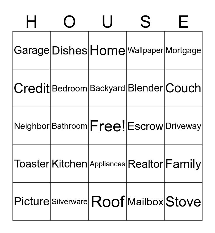 This bingo card has a free space and 24 words: Kitchen, Silverware, Backyard, Picture, Mortgage, Garage, Credit, Dishes, Escrow, Appliances, Blender, Neighbor, Realtor, Family, Bedroom, Mailbox, Driveway, Home, Couch, Bathroom, Stove, Toaster, Wallpaper and Roof.