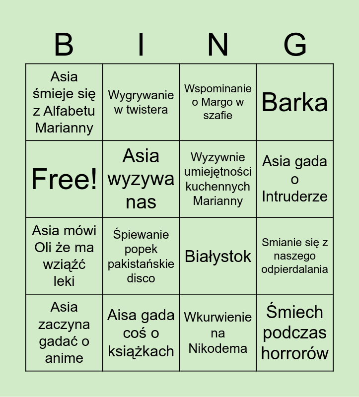 This bingo card has 16 words: Aisa gada coś o książkach, Smianie się z naszego odpierdalania, Wspominanie o Margo w szafie, Asia śmieje się z Alfabetu Marianny, Asia mówi Oli że ma wziąźć leki, Wygrywanie w twistera, Białystok, Wkurwienie na Nikodema, Free!, Asia wyzywa nas, Asia zaczyna gadać o anime, Barka, Śpiewanie popek pakistańskie disco, Asia gada o Intruderze, Wyzywnie umiejętności kuchennych Marianny and Śmiech podczas horrorów.
