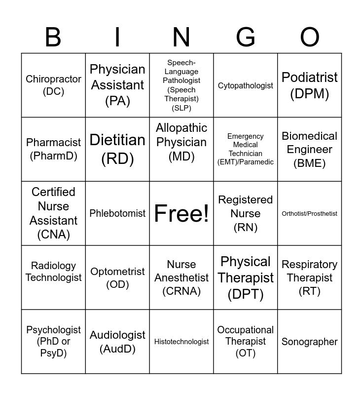 This bingo card has a free space and 24 words: Optometrist (OD), Audiologist (AudD), Allopathic Physician (MD), Psychologist (PhD or PsyD), Podiatrist (DPM), Chiropractor (DC), Pharmacist (PharmD), Physician Assistant (PA), Registered Nurse (RN), Nurse Anesthetist (CRNA), Emergency Medical Technician (EMT)/Paramedic, Certified Nurse Assistant (CNA), Physical Therapist (DPT), Respiratory Therapist (RT), Dietitian (RD), Occupational Therapist (OT), Orthotist/Prosthetist, Speech-Language Pathologist (Speech Therapist) (SLP), Biomedical Engineer (BME), Phlebotomist, Sonographer, Radiology Technologist, Cytopathologist and Histotechnologist.