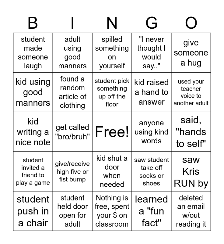 This bingo card has a free space and 24 words: give/receive high five or fist bump, student held door open for adult, student pick something up off the floor, student push in a chair, give someone a hug, student made someone laugh, kid using good manners, adult using good manners, anyone using kind words, kid shut a door when needed, kid raised a hand to answer, kid writing a nice note, saw student take off socks or shoes, saw Kris RUN by, found a random article of clothing, learned a "fun fact", said, "hands to self", spilled something on yourself, used your teacher voice to another adult, get called "bro/bruh", deleted an email w/out reading it, student invited a friend to play a game, "I never thought I would say.." and Nothing is free, spent your $ on classroom.