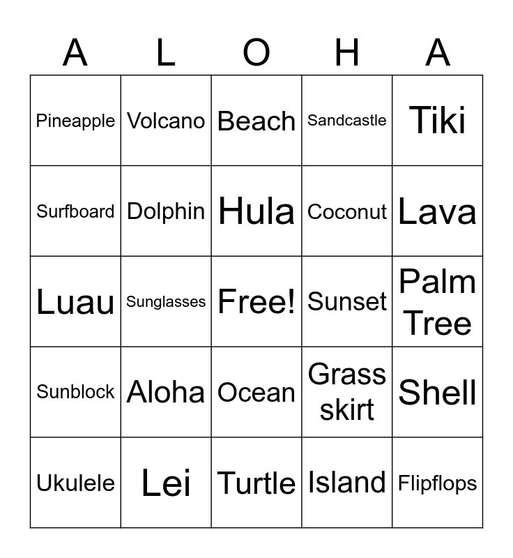 This bingo card has a free space and 24 words: Aloha, Lei, Hula, Ukulele, Tiki, Pineapple, Surfboard, Volcano, Sunset, Ocean, Coconut, Luau, Grass skirt, Shell, Dolphin, Island, Palm Tree, Beach, Lava, Sunglasses, Flipflops, Sunblock, Sandcastle and Turtle.