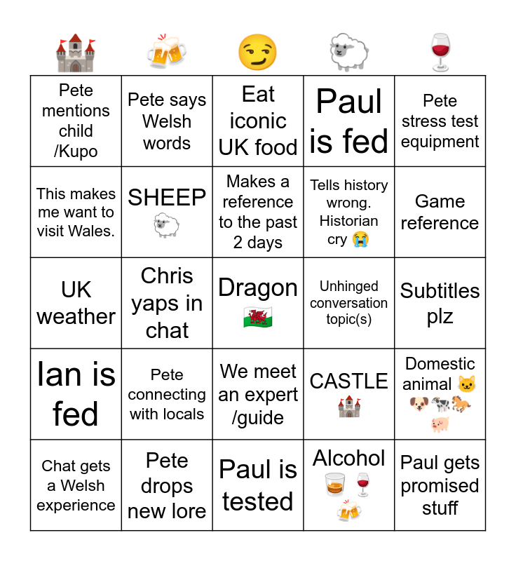 This bingo card has a free space and 24 words: Pete connecting with locals, Pete drops new lore, Makes a reference to the past 2 days, Chat gets a Welsh experience, Pete stress test equipment, Pete mentions child /Kupo, This makes me want to visit Wales., Pete says Welsh words, Unhinged conversation topic(s), We meet an expert /guide, Tells history wrong. Historian cry π, UK weather, CASTLE π°, Domestic animal π±πΆπππ, SHEEP π, Alcohol π₯π·π», Subtitles plz, Eat iconic UK food, Game reference, Chris yaps in chat, Paul gets promised stuff, Ian is fed, Paul is fed and Paul is tested.