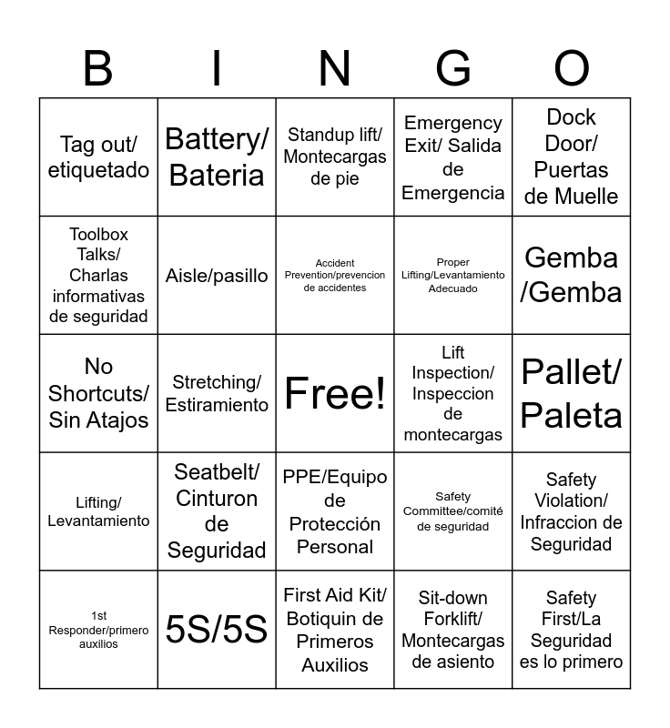 This bingo card has a free space and 44 words: Safety Walk/Recorrido de seguridad, Safety First/La Seguridad es lo primero, We are all Safety/Todos somos seguridad, 1st Responder/primero auxilios, Moving Parts/partes moviles, Sit-down Forklift/ Montecargas de asiento, Standup lift/ Montecargas de pie, 3 points of contact/ Tres puntos de Contacto, Dock Door/ Puertas de Muelle, 5S/5S, Emergency Exit/ Salida de Emergencia, Lift Inspection/ Inspeccion de montecargas, PPE/Equipo de Protección Personal, Seatbelt/ Cinturon de Seguridad, Eye Cleaning Station/ Estación de Limpieza de Ojos, First Aid Kit/ Botiquin de Primeros Auxilios, Fire Extinguisher/ Extintor de Incendios, No Shortcuts/ Sin Atajos, Safety Inspection/ Inspeccion de Seguridad, Gemba /Gemba, Battery/ Bateria, Charging Station/ Estacion de Carga, Lock out/ Cierre Patronal, Tag out/ etiquetado, Red tag/Etiqueta Roja, Pallet/ Paleta, OSHA/OSHA, Near Miss/Casi accidente, Safety Committee/comité de seguridad, Lifting/ Levantamiento, Gloves/ Guantes, Safety Violation/ Infraccion de Seguridad, Training/ Capacitacion, Clean as you go/ Limpia mientras trabajas, Stretching/ Estiramiento, Safety Vest/ Chaleco de seguridad, Horn/claxon, Steel Toe Shoes/ zapatos con punta de acero, Accident Prevention/prevencion de accidentes, Toolbox Talks/ Charlas informativas de seguridad, Proper Lifting/Levantamiento Adecuado, Box Cutter/cortadora de caja, Aisle/pasillo and Safety Leader/Líder de Seguridad.