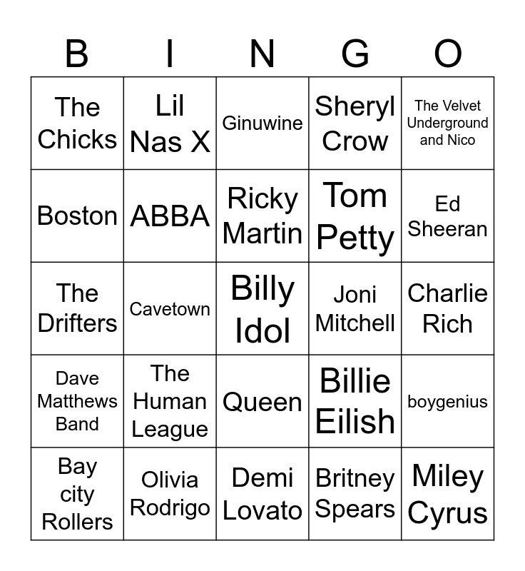 This bingo card has 45 words: T Rex, Billy Idol, Fergie, Bay city Rollers, Tessa Violet, Britney Spears, Ginuwine, Sister Sledge, The Velvet Underground and Nico, Olivia Rodrigo, Sheryl Crow, Joni Mitchell, Queen, The Human League, The Kingsmen, Demi Lovato, Jet, The Drifters, Pitbull, Ke$ha, Ed Sheeran, Lil Nas X, My Chemical Romance, The Police, The Chicks, Bryan Adams, Charlie Rich, Katy Perry, The Emotions, Billie Eilish, Dave Matthews Band, Cardi B, boygenius, Lauryn Hill, Stevie Nicks, Prince, Cavetown, Ariana Grande, Iggy Azalea, Mountain, Miley Cyrus, Ricky Martin, Boston, Tom Petty, The Rolling Stones, ABBA and Toby Keith.