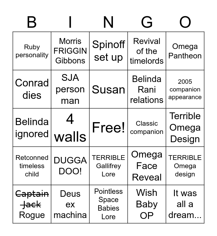 This bingo card has a free space and 30 words: Deus ex machina, terribly explained, 4 walls, flood betray, Ruby personality, Spinoff set up, SJA person man, TERRIBLE Gallifrey Lore, Classic companion, Pointless Space Babies Lore, Terrible Omega Design, It was all a dream..., Wish Baby OP, Woke nonsense, 2005 companion appearance, Hugely Cringe/ unfunny, Omega Face Reveal, Retconned timeless child, DUGGA DOO!, Omega Pantheon, Belinda ignored, Regeneration, Morris FRIGGIN Gibbons, Belinda Rani relations, Conrad dies, Revival of the timelords, TERRIBLE Omega design, C̶a̶p̶t̶a̶i̶n̶ J̶a̶c̶k̶ Rogue, Susan and Joe Gladwin appears.