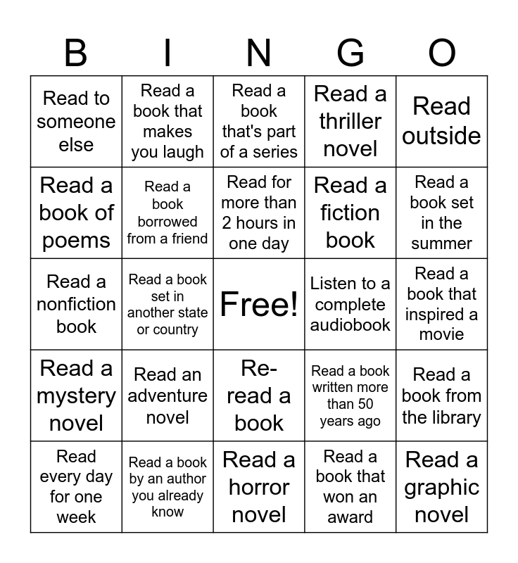 This bingo card has a free space and 24 words: Read an adventure novel, Read a book by an author you already know, Read for more than 2 hours in one day, Read every day for one week, Read outside, Read to someone else, Read a book of poems, Read a book that makes you laugh, Listen to a complete audiobook, Re-read a book, Read a fiction book, Read a nonfiction book, Read a book written more than 50 years ago, Read a book from the library, Read a book borrowed from a friend, Read a book that won an award, Read a book that inspired a movie, Read a book that's part of a series, Read a book set in the summer, Read a book set in another state or country, Read a graphic novel, Read a mystery novel, Read a thriller novel and Read a horror novel.
