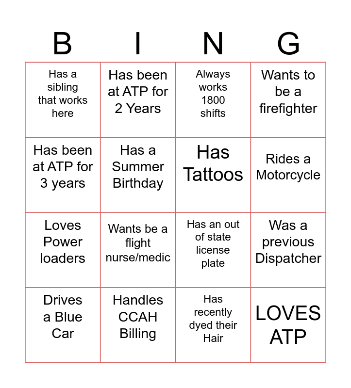This bingo card has 16 words: Handles CCAH Billing, Was a previous Dispatcher, Always works 1800 shifts, Has a sibling that works here, Loves Power loaders, Has been at ATP for 2 Years, Has an out of state license plate, Has recently dyed their Hair, Has been at ATP for 3 years, Has a Summer Birthday, Drives a Blue Car, Wants to be a firefighter, Wants be a flight nurse/medic, Rides a Motorcycle, Has Tattoos and LOVES ATP.