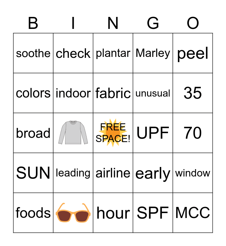 This bingo card has 4 images, a free space and 26 words: soothe, plantar, indoor, airline, UPF, hour, 70, MCC, SPF, sunscreen, 35, red, early, SUN, leading, peel, broad, U.S., check, unusual, colors, Marley, window, foods, fabric and spots.