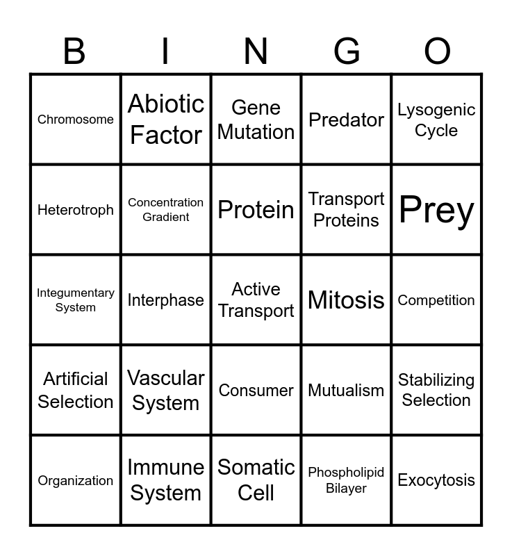 This bingo card has 185 words: Biology, Organism, Organization, Growth, Development, Reproduction, Species, Stimulus, Response, Adaptation, Homeostasis, Macromolecule, Polymer, Carbohydrate, Protein, Amino Acid, Lipid, Nucleic Acid, Nucleotide, Activation Energy, Catalyst, Enzyme, Substrate, Active Site, Cell Membrane, Cytoplasm, DNA/Genetic Material, Eukaryote, Nucleus, Organelle, Bacteria, Binary Fission, Archaea, Endosymbiosis, Cell Wall, Chloroplast, Mitochondria, Ribosome, Prokaryote, Antibiotic, Toxin, Eukarya, Virus, Capsid, Lytic Cycle, Lysogenic Cycle, Retrovirus, Viroid, Covid-19, HIV, Immune System, Vaccine, Phospholipid Bilayer, Transport Proteins, Fluid Mosaic Model, Selective Permeability, Diffusion, Dynamic Equilibrium, Osmosis, Hyptonic, Isotonic, Hypertonic, Facilitated Diffusion, Active Transport, Endocytosis, Exocytosis, ATP, Concentration Gradient, Thylakoids, Grana, Stroma, Electron Transport Chain, Calvin Cycle, Aerobic Respiration, Anaerobic Respiration, Glycolysis, Krebs Cycle, Fermentation, Cellular Respiration, Glucose, Photosynthesis, Deoxyribonucleic Acid, Double Helix, Hydrogen Bonds, Nitrogenous Base, Base Pair Rules, Trait, Chromosome, Complementary Strand, Genetic Code, Polypeptide Chain, Alelle, Codon, mRNA, Gene Expression, Nitrogen Bases, Transcription, Translation, tRNA, Anticodon, Chromosomal Mutation, Gene Mutation, Somatic Cell, Silent Mutation, Insertion Mutation, Gamete, Cell Cycle, Mitosis, Prophase, Metaphase, Anaphase, Telophase, Interphase, Diploid, Daughter Cell, Spindle Fibers, Chromatid, Cytokinesis, Centromere, Centriole, Fossil, Evolution, Homologous Structure, Vestigial Structure, Analogous Structure, Genus, Embryo, Artificial Selection, Natural Selection, Diversity, Habitat, Competition, Disruptive Selection, Stabilizing Selection, Predator, Prey, Offspring, Population, Directional Selection, Fitness, Bottleneck Effect, Gene Flow, Mutation, Genetic Drift, Founder Effect, 10% Energy Rule, Abiotic Factor, Autotroph, Biotic Factor, Carnivore, Consumer, Decomposer, Detritivore, Energy Pyramid, Food Chain, Food Web, Herbivore, Heterotroph, Omnivore, Trophic Level, Nitrogen Fixation, Commensalism, Mutualism, Parasitism, Symbiosis, Invasive Species, Resistance, Guard Cell, Shoot System, Vascular System, Circulatory System, Defense, Digestive System, Endocrine System, Excretory System, Homeostasis, Integumentary System, Lymphatic System, Muscular System, Nervous System, Reproductive System, Nutrient Absorption, Pathogen, Respiratory System and Skeletal System.