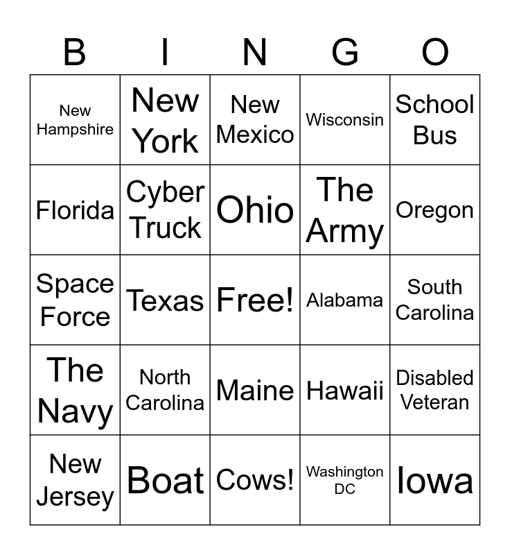 This bingo card has a free space and 70 words: Nevada, South Carolina, West Virginia, Indiana, Boat, Virginia, Wisconsin, Canada, School Bus, California, Disabled Veteran, Idaho, New Hampshire, New Mexico, Kansas, Texas, Maine, The Army, Minnesota, The Navy, Alabama, Hawaii, Oregon, Kentucky, Utah, Wyoming, Illinois, Louisiana, Washington DC, Massachusetts, New York, Rhode Island, Air Force, Motorcycle, North Dakota, Animal Trailer, Horses, Marines, Oklahoma, Florida, Washington, North Carolina, Iowa, Colorado, Alaska, Cyber Truck, New Jersey, Georgia, Doggy!, Connecticut, Arizona, Pennsylvania, Nebraska, Mexico, Cows!, Mississippi, Ohio, Delaware, Vermont, Retired Veteran, Space Force, USPS, South Dakota, Maryland, Tennessee, Missouri, Montana, Government Vehicle, Michigan and Arkansas.