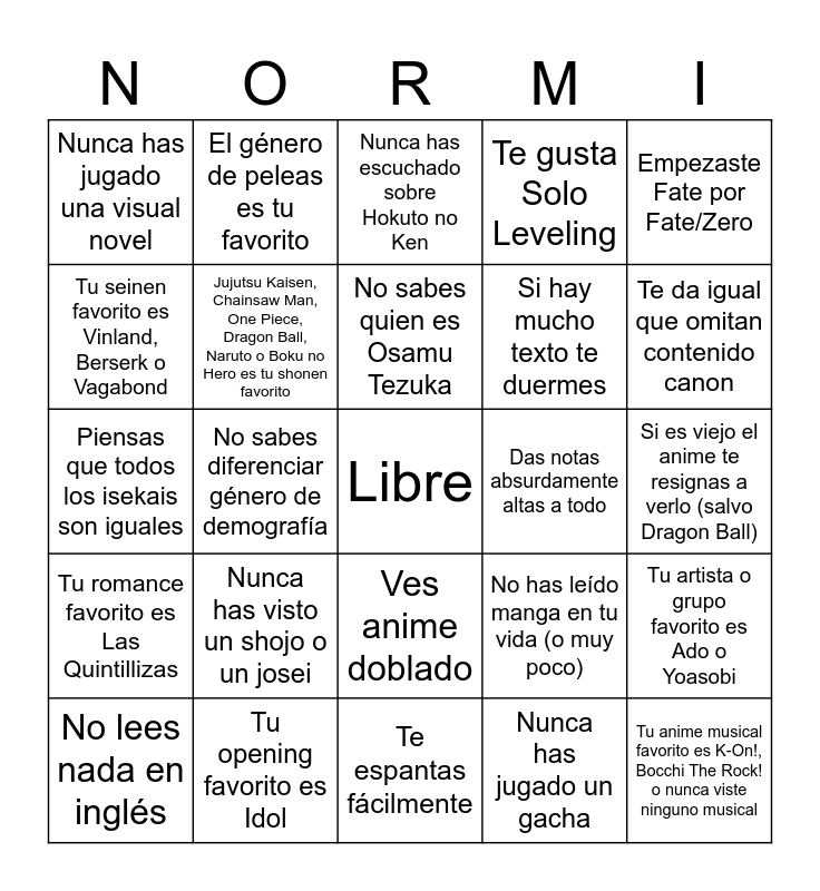 This bingo card has a free space and 24 words: Nunca has visto un shojo o un josei, Tu opening favorito es Idol, No sabes quien es Osamu Tezuka, No lees nada en inglés, Empezaste Fate por Fate/Zero, Nunca has jugado una visual novel, Tu seinen favorito es Vinland, Berserk o Vagabond, El género de peleas es tu favorito, Das notas absurdamente altas a todo, Ves anime doblado, Si hay mucho texto te duermes, Piensas que todos los isekais son iguales, No has leído manga en tu vida (o muy poco), Tu artista o grupo favorito es Ado o Yoasobi, Jujutsu Kaisen, Chainsaw Man, One Piece, Dragon Ball, Naruto o Boku no Hero es tu shonen favorito, Nunca has jugado un gacha, Si es viejo el anime te resignas a verlo (salvo Dragon Ball), Nunca has escuchado sobre Hokuto no Ken, Te da igual que omitan contenido canon, No sabes diferenciar género de demografía, Tu anime musical favorito es K-On!, Bocchi The Rock! o nunca viste ninguno musical, Tu romance favorito es Las Quintillizas, Te gusta Solo Leveling and Te espantas fácilmente.
