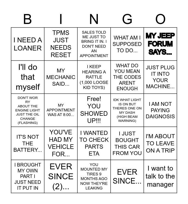 This bingo card has a free space and 24 words: I BROUGHT MY OWN PART I JUST NEED IT PUT IN, YOU'VE HAD MY VEHICLE FOR..., I KEEP HEARING A RATTLE (1,000 LOOSE KID TOYS), EVER SINCE..., MY JEEP FORUM SAYS..., I NEED A LOANER, TPMS JUST NEEDS RESET, SALES TOLD ME JUST TO BRING IT IN. I DON'T NEED AN APPOINTMENT, IDK WHAT LIGHT IS ON BUT THERES ONE ON MY DASH (HIGH BEAM WARNING), I AM NOT PAYING DAIGNOSIS, DON'T WORRY ABOUT THE ENGINE LIGHT JUST THE OIL CHANGE (FLASHING), MY MECHANIC SAID..., I JUST BOUGHT THIS CAR FROM YOU, I'M ABOUT TO LEAVE ON A TRIP, I'll do that myself, EVER SINCE (2)..., YOU MOUNTED MY TIRES 9 MONTHS AGO NOW THEY'RE LEAKING, WHAT AM I SUPPOSED TO DO..., JUST PLUG IT INTO YOUR MACHINE..., IT'S NOT THE BATTERY..., MY APPOINTMENT WAS AT 8:00..., I WANTED TO CHECK PARTS ETA, WHAT DO YOU MEAN THE CODES ARENT ENOUGH and I want to talk to the manager.