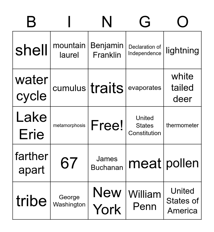 This bingo card has a free space and 44 words: North America, United States of America, Native Americans, tribe, Admiral Penn, William Penn, Benjamin Franklin, bifocals, lightning, George Washington, Declaration of Independence, United States Constitution, James Buchanan, 67, Chester, New York, Ohio, Lake Erie, Delaware River, white tailed deer, mountain laurel, great dane, rooster, shell, 21, thermometer, pores, 50, meat, farther apart, wet, pollen, nectar, seeds, metamorphosis, groups, communicate, colony, traits, water cycle, evaporates, precipitation, cumulus and stratonimbus.