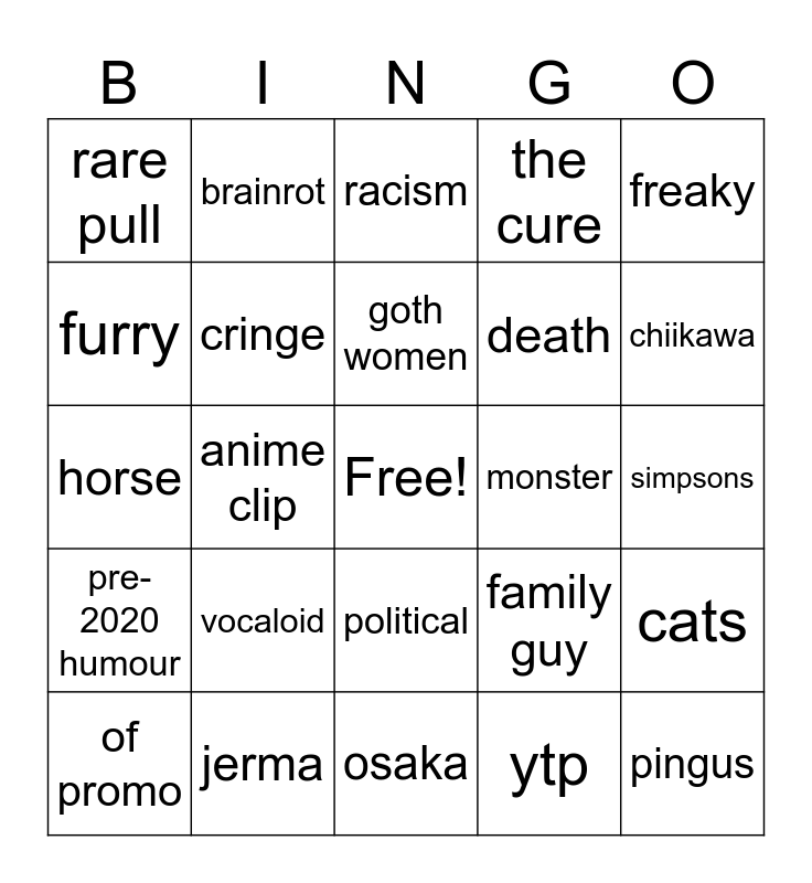 This bingo card has a free space and 24 words: vocaloid, jerma, goth women, of promo, freaky, rare pull, furry, brainrot, monster, political, death, horse, family guy, cats, cringe, ytp, simpsons, racism, chiikawa, anime clip, pingus, pre-2020 humour, the cure and osaka.