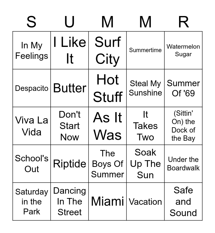 This bingo card has 60 words: Good Times, Dancing In The Street, California Gurls, School's Out, Vacation, Cruel Summer, Butter, Summer Girls, Steal My Sunshine, Summer Breeze, Summertime, Old Town Road, Despacito, HOT TO GO!, In the Summertime, In My Feelings, As It Was, Watermelon Sugar, Miserlou, Hot Stuff, It Takes Two, Surf City, Saturday in the Park, Under the Boardwalk, Hot In Herre, Summer, Feels Like Summer, Doin' Time, Summer Of '69, All Summer Long, Summertime Sadness, Margaritaville, Cheeseburger In Paradise, Walking On Sunshine, I Like It, Rockaway Beach, Ocean Avenue, Don't Start Now, Levitating, Viva La Vida, High Hopes, Riptide, (Sittin' On) the Dock of the Bay, Rather Be, Soak Up The Sun, Summer Love, Summer in the City, Conga, All Night Long (All Night), The Boys Of Summer, Miami, Smooth, Run-Around, Maria Maria, Hey Ya!, Move Your Feet, One Kiss, Pompeii, Safe and Sound and Fly Like An Eagle.