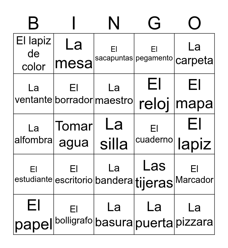 This bingo card has 25 words: El escritorio, La basura, La maestro, El papel, La carpeta, El lapiz de color, La ventante, La mesa, El cuaderno, La bandera, El reloj, La alfombra, Las tijeras, El Marcador, El borrador, La pizzara, El lapiz, El sacapuntas, El mapa, Tomar agua, La silla, El bolligrafo, El estudiante, El pegamento and La puerta.