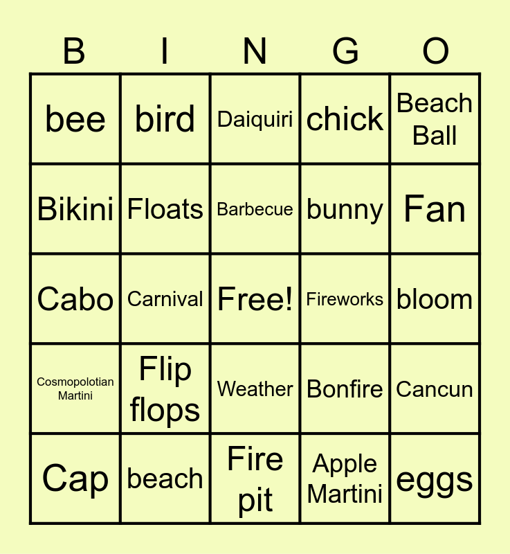 This bingo card has a free space and 26 words: Weather, Apple Martini, Barbecue, beach, Beach Ball, bee, Bikini, bird, bloom, Bonfire, bunny, Cabo, Cancun, Cap, Carnival, Chanclas (flip flops in Spanish), chick, Cosmopolotian Martini, Daiquiri, eggs, Fan, Fire pit, Fireworks, Flip flops, Floats and Flowers.