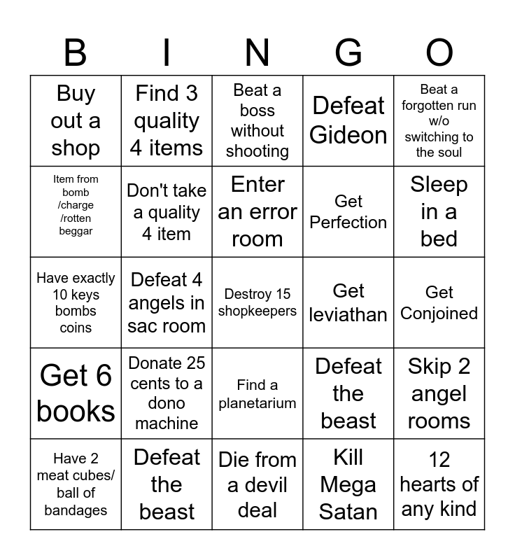 This bingo card has 25 words: Donate 25 cents to a dono machine, Die from a devil deal, Enter an error room, Have 2 meat cubes/ ball of bandages, Beat a forgotten run w/o switching to the soul, Buy out a shop, Item from bomb /charge /rotten beggar, Find 3 quality 4 items, Get leviathan, Find a planetarium, Get Perfection, Have exactly 10 keys bombs coins, Defeat the beast, Skip 2 angel rooms, Don't take a quality 4 item, 12 hearts of any kind, Get Conjoined, Beat a boss without shooting, Sleep in a bed, Defeat 4 angels in sac room, Destroy 15 shopkeepers, Defeat the beast, Get 6 books, Defeat Gideon and Kill Mega Satan.