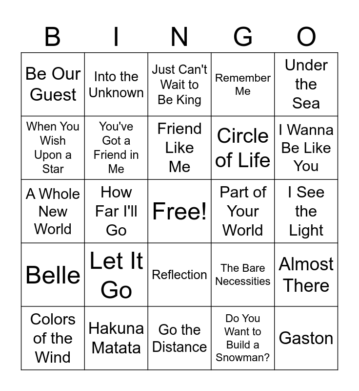 This bingo card has a free space and 24 words: Let It Go, Hakuna Matata, Friend Like Me, Colors of the Wind, Under the Sea, Be Our Guest, When You Wish Upon a Star, Into the Unknown, Part of Your World, Reflection, Circle of Life, A Whole New World, The Bare Necessities, Almost There, You've Got a Friend in Me, Do You Want to Build a Snowman?, I See the Light, Just Can't Wait to Be King, I Wanna Be Like You, How Far I'll Go, Gaston, Belle, Remember Me and Go the Distance.