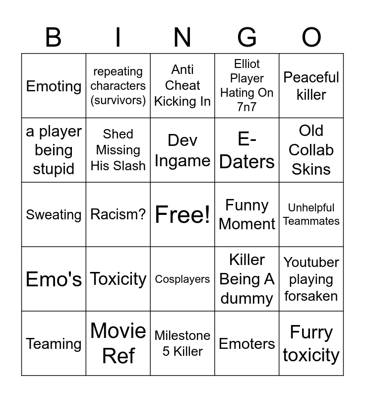 This bingo card has a free space and 24 words: Toxicity, Movie Ref, Dev Ingame, Teaming, Peaceful killer, Emoting, a player being stupid, repeating characters (survivors), Funny Moment, Cosplayers, E-Daters, Sweating, Killer Being A dummy, Youtuber playing forsaken, Shed Missing His Slash, Emoters, Unhelpful Teammates, Anti Cheat Kicking In, Old Collab Skins, Racism?, Furry toxicity, Emo's, Elliot Player Hating On 7n7 and Milestone 5 Killer.