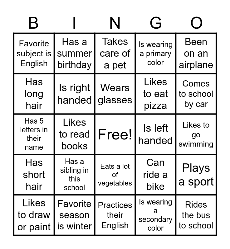 This bingo card has a free space and 24 words: Has a sibling in this school, Favorite season is winter, Wears glasses, Likes to draw or paint, Been on an airplane, Favorite subject is English, Has long hair, Has a summer birthday, Is left handed, Eats a lot of vegetables, Likes to eat pizza, Has 5 letters in their name, Can ride a bike, Plays a sport, Is right handed, Is wearing a secondary color, Likes to go swimming, Takes care of a pet, Comes to school by car, Likes to read books, Rides the bus to school, Has short hair, Is wearing a primary color and Practices their English.