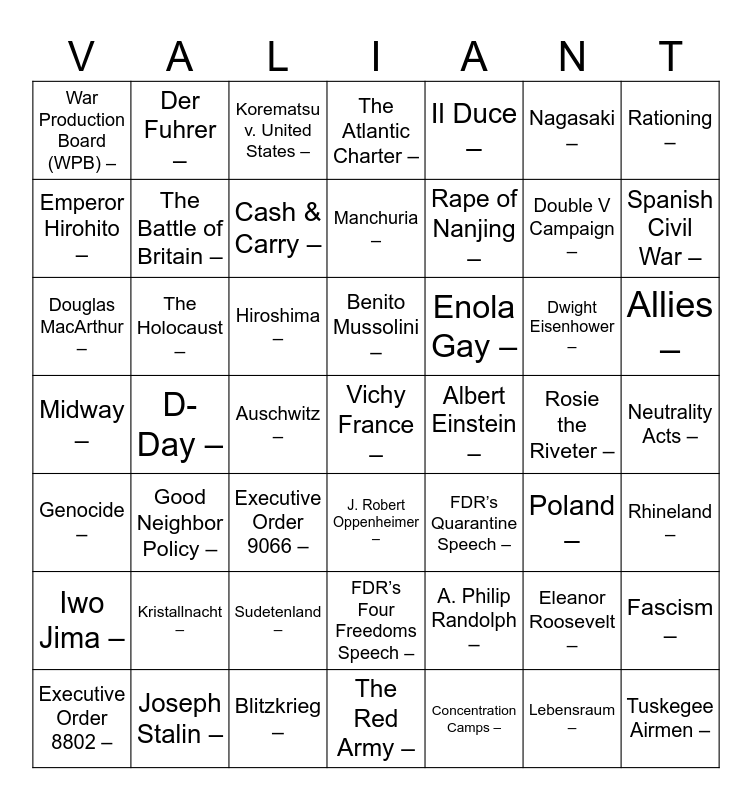 This bingo card has a free space and 86 words: Free!, Joseph Stalin –, Benito Mussolini –, Adolf Hitler –, Hideki Tojo –, Franklin Roosevelt –, Eleanor Roosevelt –, Rosie the Riveter –, A. Philip Randolph –, Neville Chamberlain –, Winston Churchill –, Harry Truman –, Dwight Eisenhower –, Douglas MacArthur –, Erwin Rommel –, Emperor Hirohito –, Albert Einstein –, J. Robert Oppenheimer –, Abyssinia –, Rhineland –, Sudetenland –, Poland –, Manchuria –, Manchukuo –, Auschwitz –, Pearl Harbor –, Stalingrad –, Normandy –, Berlin –, Coral Sea –, Midway –, Okinawa –, Iwo Jima –, Hiroshima –, Nagasaki –, Neutrality Acts –, Cash & Carry –, Lend Lease Act –, Good Neighbor Policy –, Rape of Nanjing –, FDR’s Quarantine Speech –, FDR’s Four Freedoms Speech –, Munich Pact –, Spanish Civil War –, Fascism –, Il Duce –, Nazism –, Der Fuhrer –, Anschluss –, Lebensraum –, Kristallnacht –, Concentration Camps –, The Holocaust –, War Refugee Board –, Totalitarianism –, German-Soviet Non-Aggression Pact –, Blitzkrieg –, The Battle of Britain –, The Atlantic Charter –, Rationing –, War Production Board (WPB) –, Office of Price Administration (OPA) –, GIs –, Executive Order 9066 –, Internment Camp –, Korematsu v. United States –, Women’s Army Corps (WAC) –, Double V Campaign –, Tuskegee Airmen –, Executive Order 8802 –, Congress on Racial Equality (CORE) –, Zoot Suit Riots –, Allies –, Axis Powers –, The Red Army –, Operation Overlord –, D-Day –, Genocide –, V-E Day –, Bataan Death March –, Navajo Code Talkers –, Leapfrogging/Island Hopping –, Kamikaze –, Manhattan Project –, Enola Gay – and V-J Day –.
