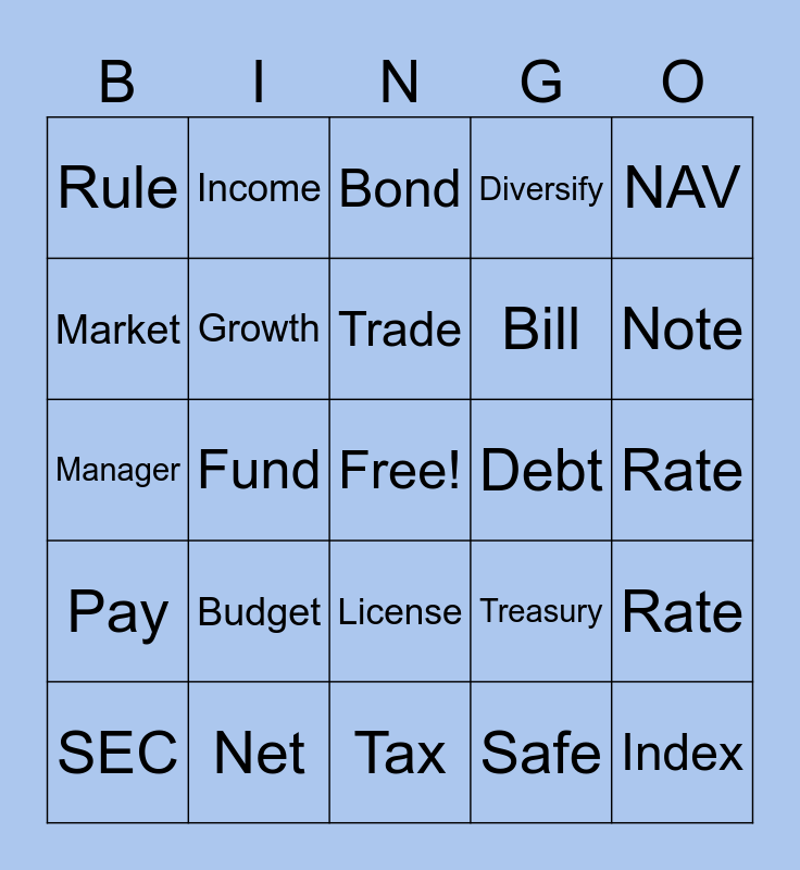 This bingo card has a free space and 75 words: Stock, Share, Bond, Debt, Equity, Dividend, Yield, Price, Risk, Return, Ticker, Broker, Trade, Market, Buy, Fund, ETF, Index, Pool, NAV, Expense, Manager, Growth, Income, Diversify, Holdings, Portfolio, Return, Risk, Shares, Cash, CD, Savings, Treasury, Note, Bill, Short, Liquid, Rate, Safe, Stable, Low, Term, Interest, Secure, FINRA, SEC, Rule, Law, Test, Exam, License, Suitability, Prospectus, Fraud, Insider, Report, Check, Risk, Broker, Budget, Save, Spend, Goal, Plan, Debt, Income, Credit, Loan, Rate, Pay, Net, Worth, Tax and Future.