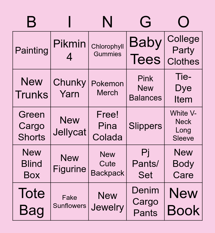 This bingo card has a free space and 24 words: New Figurine, Fake Sunflowers, Pokemon Merch, Tote Bag, College Party Clothes, Painting, New Trunks, Pikmin 4, Slippers, New Cute Backpack, Pink New Balances, Green Cargo Shorts, Pj Pants/ Set, New Body Care, Chunky Yarn, Denim Cargo Pants, White V-Neck Long Sleeve, Chlorophyll Gummies, Tie-Dye Item, New Jellycat, New Book, New Blind Box, Baby Tees and New Jewelry.
