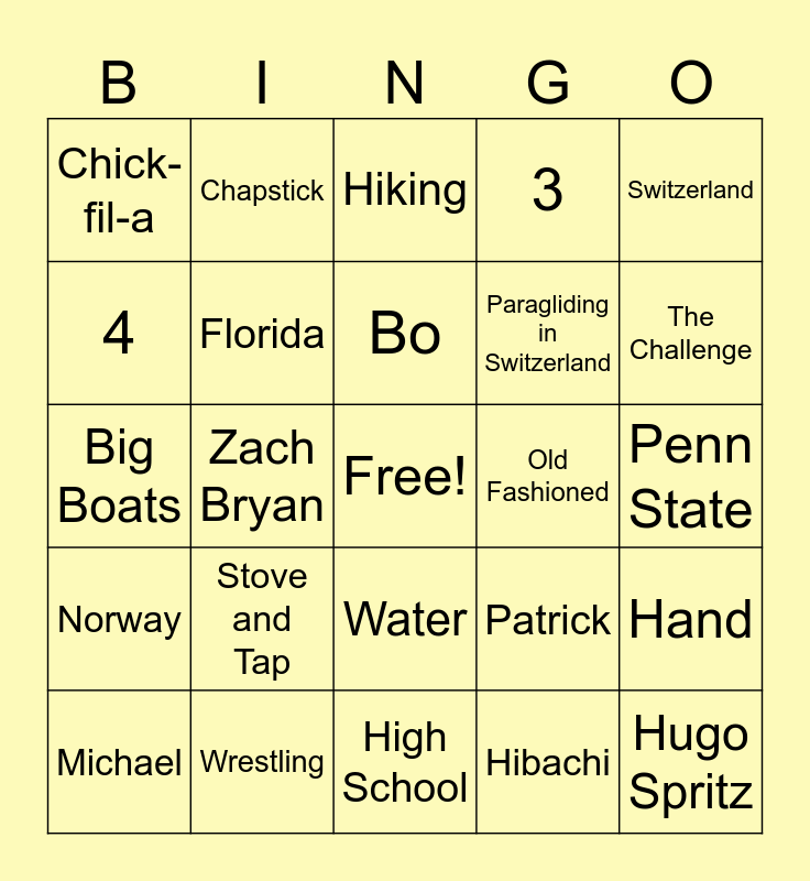 This bingo card has a free space and 24 words: Stove and Tap, Wrestling, Bo, Michael, Switzerland, Chick-fil-a, 4, Chapstick, Old Fashioned, Water, Paragliding in Switzerland, Big Boats, Patrick, Hand, Florida, Hibachi, Penn State, Hiking, The Challenge, Zach Bryan, Hugo Spritz, Norway, 3 and High School.