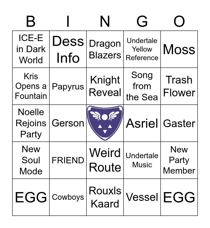 This bingo card has a free space and 24 words: EGG, FRIEND, Knight Reveal, Vessel, Moss, ICE-E in Dark World, Dess Info, Dragon Blazers, Asriel, Gaster, Noelle Rejoins Party, Papyrus, Undertale Music, New Party Member, Kris Opens a Fountain, Cowboys, Rouxls Kaard, Undertale Yellow Reference, Trash Flower, New Soul Mode, Gerson, Weird Route, Song from the Sea and EGG.