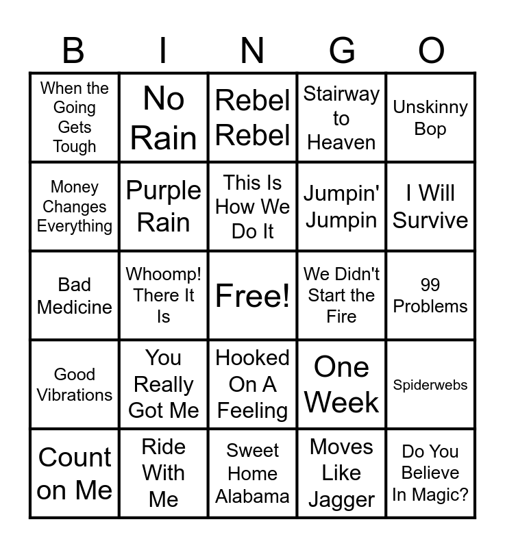 This bingo card has a free space and 37 words: Good Riddance, Take it on the Run, The Humpty Dance, Purple Rain, Spiderwebs, You Really Got Me, This Is How We Do It, Ice Ice Baby, Unskinny Bop, Semi-Charmed Life, Whoomp! There It Is, Stairway to Heaven, Do You Believe In Magic?, 99 Problems, Money Changes Everything, Good Vibrations, Do You Wanna Dance, Rebel Rebel, Hooked On A Feeling, We Didn't Start the Fire, When the Going Gets Tough, I Will Survive, Count on Me, Sweet Home Alabama, U Can't Touch This, Moves Like Jagger, No Rain, Schools Out, Three Little Birds, You Make My Dreams (Come True), Here I Go Again, Ride With Me, Bad Medicine, Pour Some Sugar on Me, One Week, Jumpin' Jumpin and Build Me Up Buttercup.