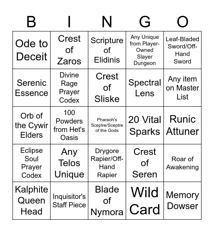 This bingo card has 25 words: Any Telos Unique, Blade of Nymora, Crest of Sliske, Kalphite Queen Head, Leaf-Bladed Sword/Off-Hand Sword, Ode to Deceit, Serenic Essence, Crest of Zaros, 20 Vital Sparks, Drygore Rapier/Off-Hand Rapier, Spectral Lens, Orb of the Cywir Elders, Crest of Seren, Roar of Awakening, Divine Rage Prayer Codex, Memory Dowser, Runic Attuner, Scripture of Elidinis, Any item on Master List, 100 Powders from Het's Oasis, Pharaoh's Sceptre/Sceptre of the Gods, Inquisitor's Staff Piece, Eclipse Soul Prayer Codex, Any Unique from Player-Owned Slayer Dungeon and Wild Card.