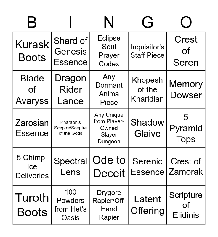This bingo card has 25 words: Spectral Lens, Drygore Rapier/Off-Hand Rapier, Any Dormant Anima Piece, Turoth Boots, Crest of Seren, Kurask Boots, Blade of Avaryss, Shard of Genesis Essence, Shadow Glaive, Ode to Deceit, Khopesh of the Kharidian, Zarosian Essence, Serenic Essence, Crest of Zamorak, Dragon Rider Lance, Scripture of Elidinis, 5 Pyramid Tops, Eclipse Soul Prayer Codex, Memory Dowser, Pharaoh's Sceptre/Sceptre of the Gods, Any Unique from Player-Owned Slayer Dungeon, 100 Powders from Het's Oasis, 5 Chimp-Ice Deliveries, Inquisitor's Staff Piece and Latent Offering.