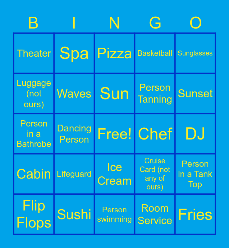 This bingo card has a free space and 39 words: Life boat, Buffet, Towel, Waves, Flip Flops, Ice Cream, Sun, Sunburned Person, Sunglasses, Cabin, Dancing Person, Basketball, Fries, DJ, Chef, Lifeguard, Elevator, Theater, Casino, Cruise Card (not any of ours), Luggage (not ours), Person swimming, Person Tanning, Sunset, Smoothie, Tropical drink, Bartender, Security, Arcade, Spa, Yoga People, Gym, Pizza, Sushi, Room Service, Coffee Bar, Person in a Tank Top, Person in a Bathrobe and Ship Map.