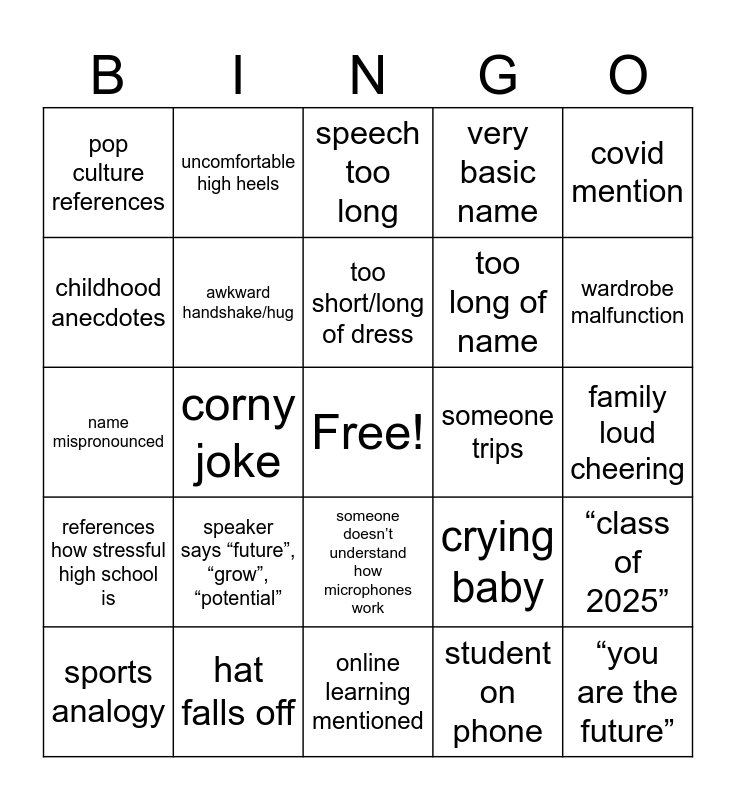 This bingo card has a free space and 24 words: speaker says “future”, “grow”, “potential”, hat falls off, too short/long of dress, sports analogy, covid mention, pop culture references, childhood anecdotes, uncomfortable high heels, someone trips, someone doesn’t understand how microphones work, too long of name, name mispronounced, crying baby, “class of 2025”, awkward handshake/hug, student on phone, family loud cheering, speech too long, wardrobe malfunction, corny joke, “you are the future”, references how stressful high school is, very basic name and online learning mentioned.
