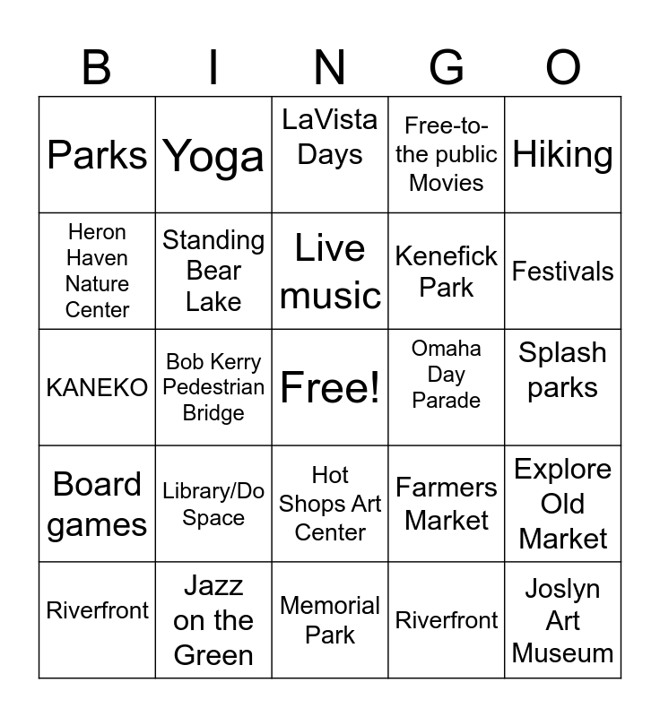 This bingo card has a free space and 29 words: Riverfront, Picnic, Bob Kerry Pedestrian Bridge, Lake Zorinsky, Parks, LaVista Days, Standing Bear Lake, Library/Do Space, Omaha Day Parade, Jazz on the Green, Splash parks, Joslyn Art Museum, Memorial Park, Riverfront, Festivals, Juneteenth Parade, Hot Shops Art Center, Board games, Hiking, KANEKO, Farmers Market, Public Art Displays, Kenefick Park, Heron Haven Nature Center, Free-to-the public Movies, Yoga, Explore Old Market, Live music and Parade.