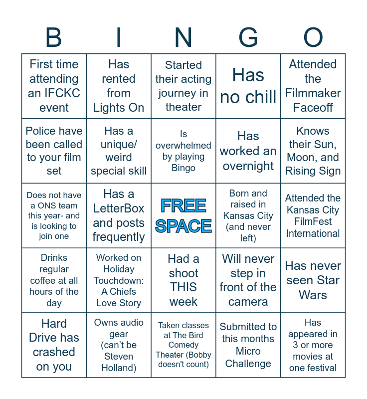 This bingo card has a free space and 24 words: Worked on Holiday Touchdown: A Chiefs Love Story, Owns audio gear (can’t be Steven Holland), Is overwhelmed by playing Bingo, Hard Drive has crashed on you, Attended the Filmmaker Faceoff, First time attending an IFCKC event, Police have been called to your film set, Has rented from Lights On, Born and raised in Kansas City (and never left), Had a shoot THIS week, Has worked an overnight, Does not have a ONS team this year- and is looking to join one, Will never step in front of the camera, Has never seen Star Wars, Has a unique/ weird special skill, Submitted to this months Micro Challenge, Attended the Kansas City FilmFest International, Started their acting journey in theater, Knows their Sun, Moon, and Rising Sign, Has a LetterBox and posts frequently, Has appeared in 3 or more movies at one festival, Drinks regular coffee at all hours of the day, Has no chill and Taken classes at The Bird Comedy Theater (Bobby doesn't count).