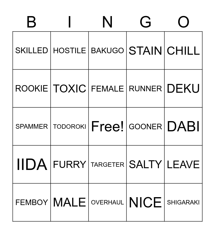 This bingo card has a free space and 24 words: FURRY, MALE, FEMALE, FEMBOY, CHILL, SKILLED, ROOKIE, HOSTILE, GOONER, TARGETER, RUNNER, SPAMMER, SALTY, LEAVE, TOXIC, NICE, DABI, BAKUGO, DEKU, TODOROKI, SHIGARAKI, IIDA, STAIN and OVERHAUL.